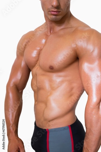 Mid section of shirtless muscular man