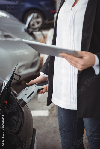 Mid section of woman using digital tablet while charging electric car