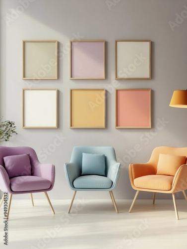 Mid-century modern living room with colorful armchairs, blank picture frames and warm natural light.