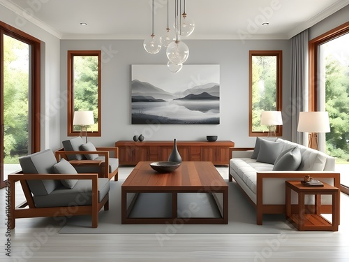 Mid-century style home interior design of modern living room. White sofa and blue leather chairs near wooden coffee table.