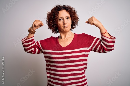 Middle age beautiful curly hair woman wearing casual striped sweater over white background showing arms muscles smiling proud. Fitness concept.