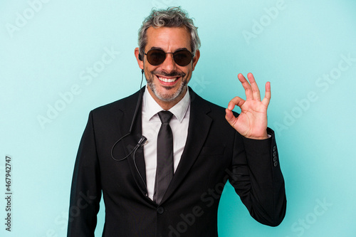 Middle age bodyguard caucasian man isolated on blue background cheerful and confident showing ok gesture.