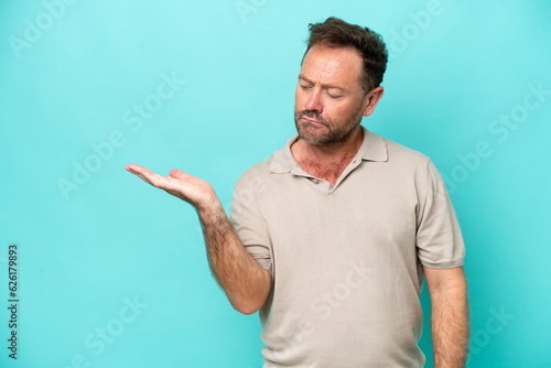 Middle age caucasian man isolated on blue background holding copyspace with doubts