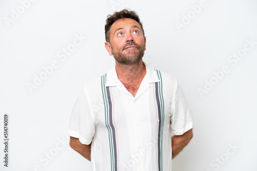 Middle age caucasian man isolated on white background and looking up