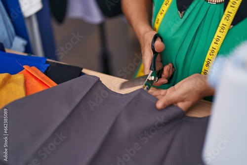 Middle age grey-haired woman tailor cutting cloth at tailor shop