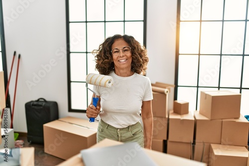 Middle age hispanic woman smiling confident holding paint roller at new home