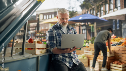 Middle Aged Businessman Working on Laptop Computer, Contacting Farm Suppliers About Fresh Produce for a Sunday Market Event. Male Sitting Next to a Street Vendor Booth with Organic GMO-Free Produce