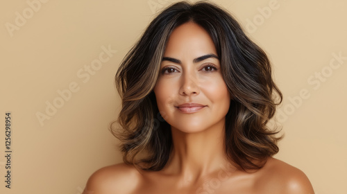 Middle aged Latina woman with shoulder length wavy hair confidently posing against a studio background while showcasing her natural beauty and poise