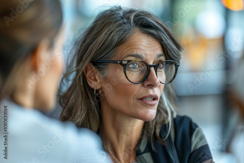 Middle aged professional businesswoman wearing glasses talking to colleague in office