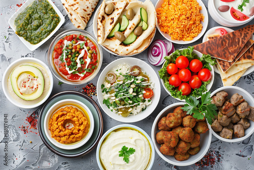 Middle Eastern Arabic dishes and assorted, meze, top view
