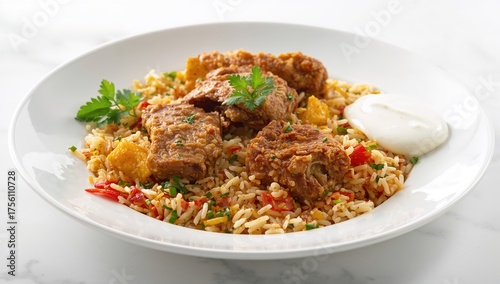 Middle Eastern cuisine. Meat pilaf. Rice combined with meat and veggies. Nutritious and tasty meal.