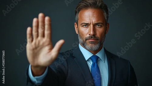 Middle-aged businessman with salt and pepper beard wearing navy suit and blue tie holding up palm in stop gesture against dark background, close-up portrait