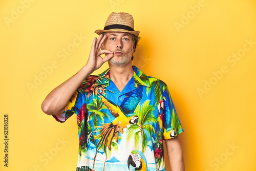 Middle-aged man in Hawaiian shirt and straw hat Middle-aged man in Hawaiian shirt and straw hatwith fingers on lips keeping a secret.