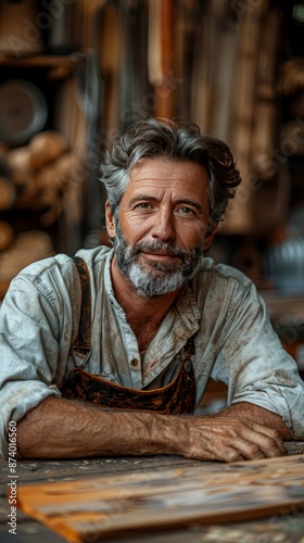 Middle-Aged Man in Workshop Working with Wood