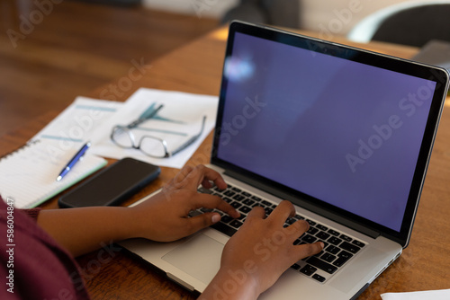 Midsection of plus size african american woman sitting at table, using laptop with copy space