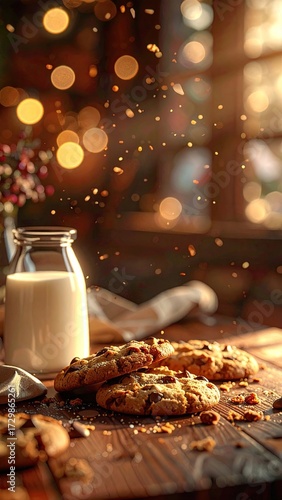 Milk and Cookies on Wooden Table with Bokeh Lights Background and Golden Dust Particles