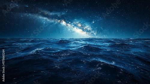 Milky Way galaxy over dark ocean waves at night.