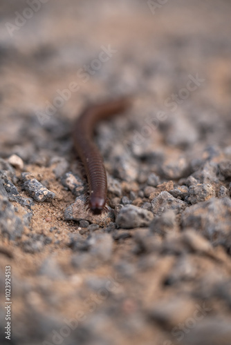 Millipede crawling over the sandy and rocky desert ground
