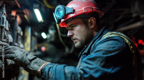 Miner Inspecting Equipment in Dark Underground Environment with Headlamp