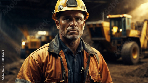 Miner worker and heavy equipment on the background