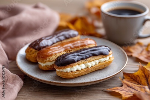 Mini eclairs with caramel, chocolate, and vanilla cream on rustic plate, autumn food styling