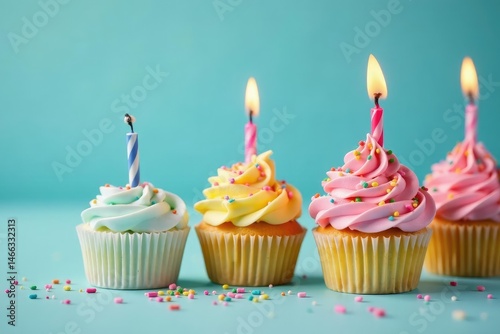 Miniature birthday cakes in cupcake form, colorful frosting and sprinkles , colorful, strawberry