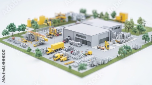 Miniature factory complex, industrial vehicles, business layout, production, warehouse