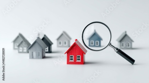 Miniature houses with a magnifying glass, symbolizing real estate, home search, and property assessment. It represents the concept of finding the perfect home.