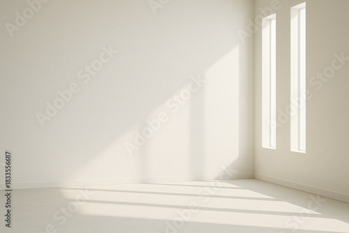 Minimal bright room with tall window openings and soft diagonal sunlight