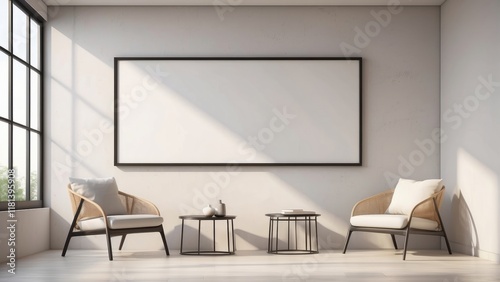 minimal living room, pearl color wall background with armchair, and blank poster frame