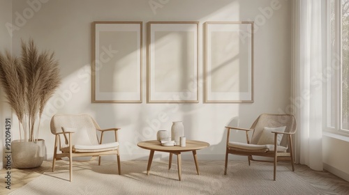 minimal living room with a table and two chairs,