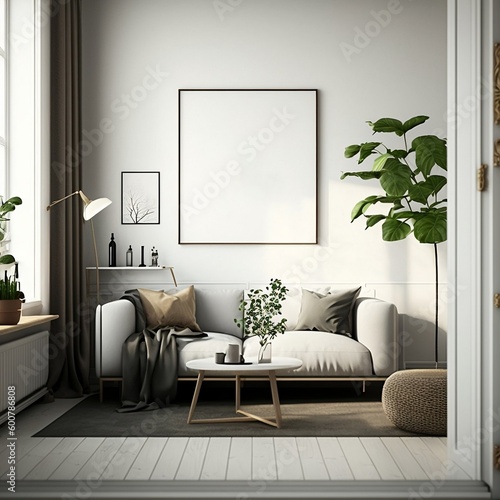 Minimal modern home living room design with blank picture frame wall mockup.