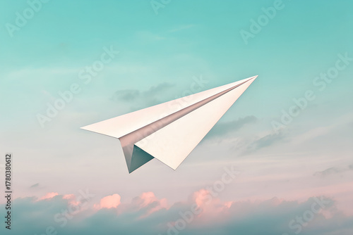 Minimal paper airplane soaring midair through pastel sky with soft focus and clean airy aesthetic composition