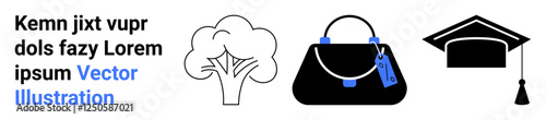 Minimal tree, handbag with tag, and graduation cap highlighting nature, fashion, and education themes. Ideal for learning, style, sustainability, achievement shopping growth flat landing page