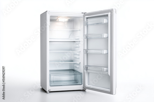Minimal white refrigerator in kitchen isolated on white background, Selective focus plain two door fridge, Open refrigerator with empty on white background.