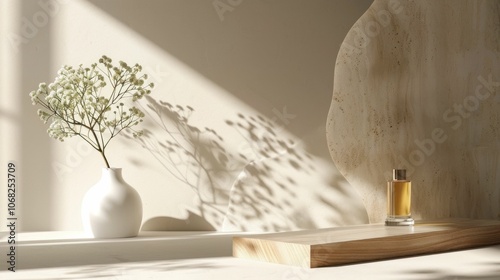 Minimalist aesthetic with a vase, flowers, and a perfume bottle on a light background featuring soft shadows and natural light