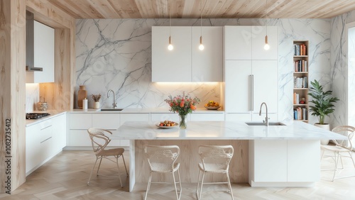 Minimalist and elegant kitchen with marble for floors and wall tiles