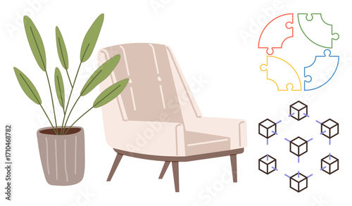 Minimalist armchair beside leafy plant, colorful puzzle pieces, linked cubes symbolizing teamwork, creativity, and collaboration. Ideal for innovation, comfort, strategy, solutions learning design