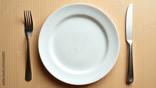 Minimalist arrangement of an empty white plate with cutlery on a warm surface