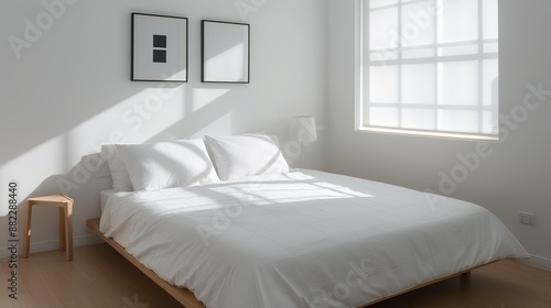 Minimalist bedroom featuring a platform bed, crisp white linens, and simple decor creating a peaceful and uncluttered retreat ideal for restful sleep High Resolution picture, , Minimalism,