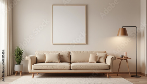Minimalist beige sofa with blank frame in modern living room