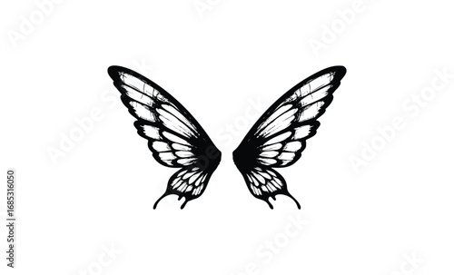 Minimalist black and white butterfly wings with intricate patterns. Vector retro hand drawn illustration