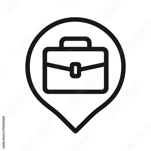 Minimalist black briefcase vector inside a pin shape, representing business, investment, and professional financial management tools.