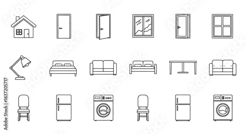 Minimalist black line art icon set of home furniture, appliances, and architectural elements.