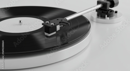 Minimalist Black Vinyl Record on White Turntable, Close Up
