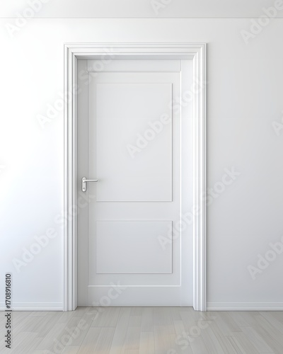 minimalist bright room with a white door slightly open, strong soft light coming from outside