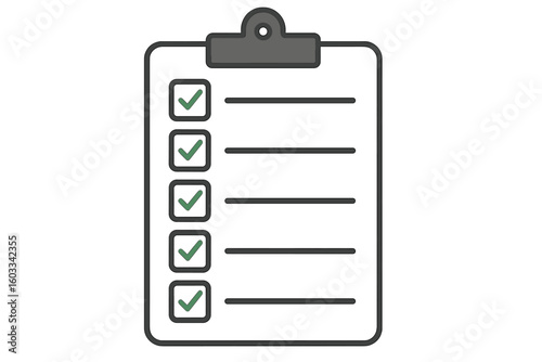 Minimalist Checklist Clipboard with Five Green Check Marks, Blank Lines, Simple Flat Outline Style, Isolated Vector for Task Management, To-Do List, Goals Accomplished, Productivity Planning Concepts