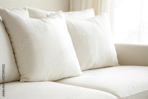 Minimalist cozy white cushions on modern sofa in bright living room interior for home decor inspiration