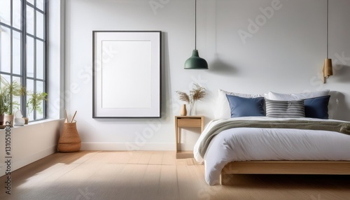 Minimalist Elegance Empty Canvas Framed against a Breezy White Bedroom Wall, Inviting Creativity and Inspirational Serenity