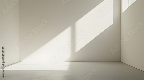 Minimalist Empty Room: Light Beige Walls/Floor + Natural Light from Top-Right Casts Triangular Light Patterns, Serene & Spacious